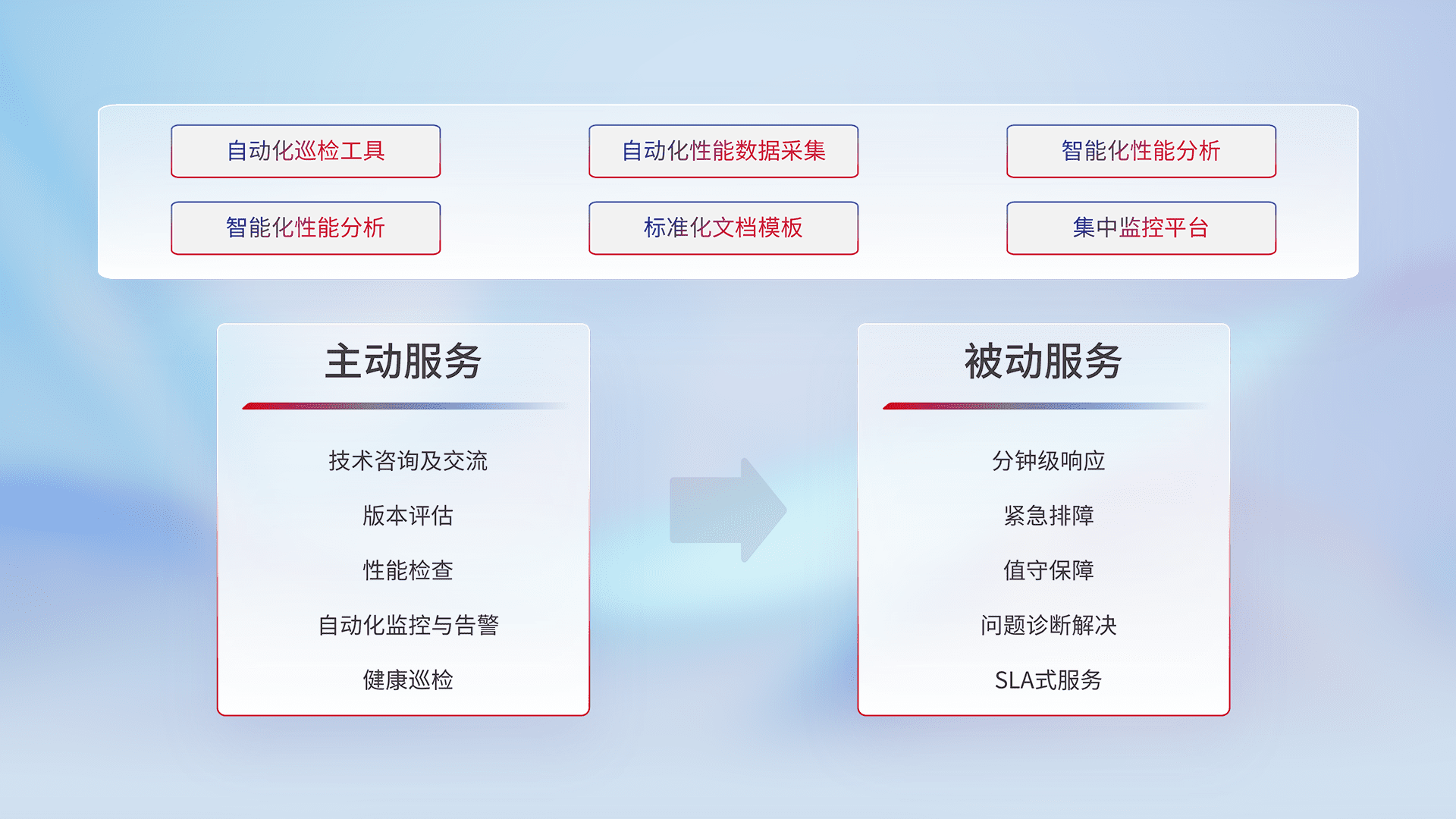 智能化工具和标准化文档,,,保障服务质量,,提供主动服务(包含技术咨询、、、、版本评估、、性能检查、、、、自动化监控与告警、、健康巡检)和被动服务包含(分钟级响应、、、、紧急排障、、、值守保障、、问题诊断解决、、、SLA服务)。。。。