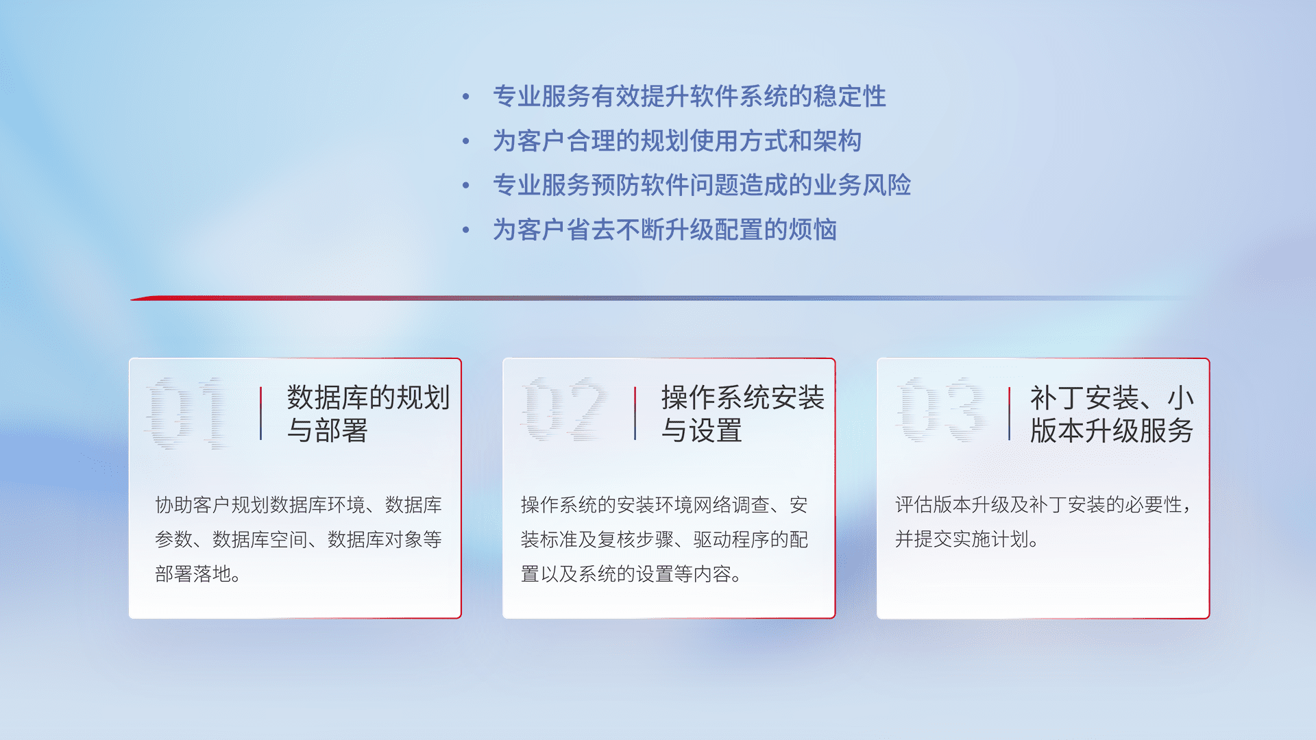 为客户提供软件规模升级、、、快速部署、、、按需配置的专业服务,,从数据库的规划与部署到操作系统的安装与设置,,再到补丁安装和小版本升级提供支持。。。。